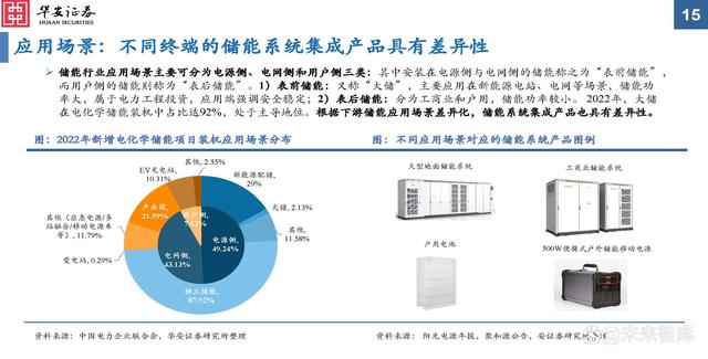 儲能行業(yè)應(yīng)用場景主要可分為電源側(cè)、電網(wǎng)側(cè)和用戶側(cè)三類:其中安裝在電源側(cè)與電網(wǎng)側(cè)的儲能稱之為“表前儲能”,而用戶側(cè)的儲能則稱為“表后儲能”。1)表前儲能:又稱“大儲”,主要應(yīng)用在新能源電站、電網(wǎng)等場景,儲能功率大,屬于電力工程投資,應(yīng)用端強調(diào)安全穩(wěn)定;2)表后儲能:分為工商業(yè)和戶用,儲能功率較小。2022年,大儲在電化學(xué)儲能裝機中占比達92%,處于主導(dǎo)地位。根據(jù)下游儲能應(yīng)用場景差異化,儲能系統(tǒng)集成產(chǎn)品也具有差異性。