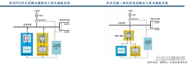 商業(yè)儲能系統(tǒng)架構(gòu)主要有兩種:1)采用 PCS 的交流耦合型;2)采用光儲一體機(jī)的直流耦合型。交流耦合系統(tǒng)與儲能電站的系統(tǒng)配置類似,但相對用量較小,系統(tǒng)功能也更為簡單,其中的光伏系統(tǒng)和儲能系統(tǒng)并聯(lián),靈活性較高,適用于已安裝工商業(yè)光伏的存量市場。直流耦合系統(tǒng)通過光儲一體機(jī)將光伏逆變器和雙向變流器整合在一起,相比交流耦合系統(tǒng)具有高度集成化、軟性成本低的特點,50-100kW 的光儲一體機(jī)已逐漸成為中小工商業(yè)儲能系統(tǒng)的選擇。