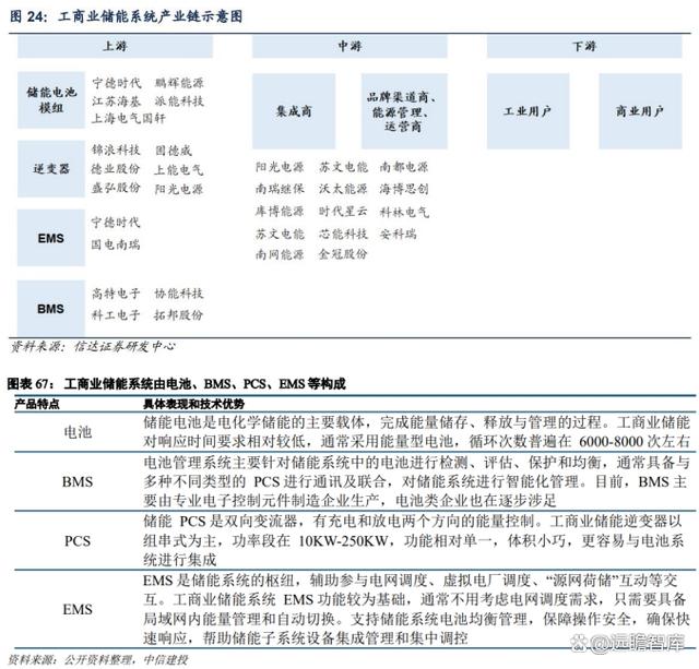 工商業(yè)儲能系統(tǒng)產(chǎn)業(yè)鏈完善,與大儲、戶儲同源。上游是各類設(shè)備,中游是系統(tǒng)集成商和開發(fā)運(yùn)營商,下游是工商業(yè)運(yùn)營商。上游部件環(huán)節(jié)中,儲能電池模組由電芯經(jīng)過串并聯(lián)組成用以儲存電力;逆變器進(jìn)行交流電與直流電的轉(zhuǎn)換,根據(jù)功率指令對電池進(jìn)行充放電;BMS 是控制、管理電池各項(xiàng)功能并保護(hù)電池的核心部件,亦具備和 EMS、SCADA(能量管理系統(tǒng)及監(jiān)控系統(tǒng))通訊功能,目前也有部分電池廠家開始自主設(shè)計(jì) BMS;EMS 控制逆變器并采集逆變器數(shù)據(jù)、控制電池模組并采集電芯數(shù)據(jù)、執(zhí)行邏輯(各種應(yīng)用)并與其他設(shè)備集成調(diào)度。中游集成商與品牌渠道商直接與下游工商業(yè)用戶對接,需要對BMS/EMS 系統(tǒng)及儲能應(yīng)用場景有著高理解,且 BMS/EMS 系統(tǒng)基本為自研,以完成對上游設(shè)備的高效整合。
