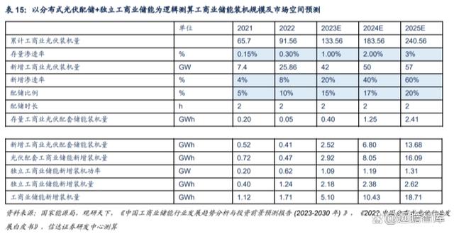 光伏發(fā)電市場(chǎng)化交易態(tài)勢(shì)明確,光伏配儲(chǔ)經(jīng)濟(jì)性有望凸顯。在收益不斷提升、成本不斷下降、政策持續(xù)推動(dòng)、缺電焦慮持續(xù)的情況下,預(yù)計(jì)未來(lái)兩年經(jīng)濟(jì)性將推動(dòng)工商業(yè)儲(chǔ)能快速發(fā)展?;冢?)存量、新增分布式光伏配套儲(chǔ)能滲透率不斷提升,23 年分別至 1%、20%。2)配儲(chǔ)比例逐步提升至 15%。3)參考觀研天下數(shù)據(jù),獨(dú)立工商業(yè)儲(chǔ)能新增裝機(jī)逐步提升至 2023 年的 2.2GWh。測(cè)算得到工商業(yè)儲(chǔ)能需求2023-2025 年有望達(dá) 5.1(+199%)、10.4、18.7GWh。