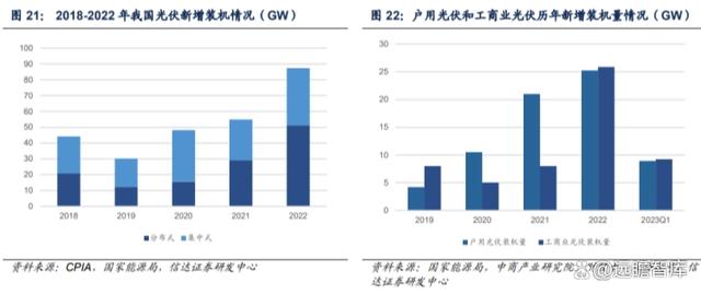 工商業(yè)光伏裝機(jī)量趕超戶(hù)用光伏裝機(jī)量,發(fā)展駛?cè)肟燔?chē)道,2022 年工商業(yè)光伏新增裝機(jī)量同比增長(zhǎng)236%,2021 年 6 月國(guó)家能源局指出 2023 年底,工商業(yè)廠房屋頂總面積可安裝光伏發(fā)電比例不低于30%。展望今年,工商業(yè)光伏有望延續(xù)蓬勃發(fā)展態(tài)勢(shì)。