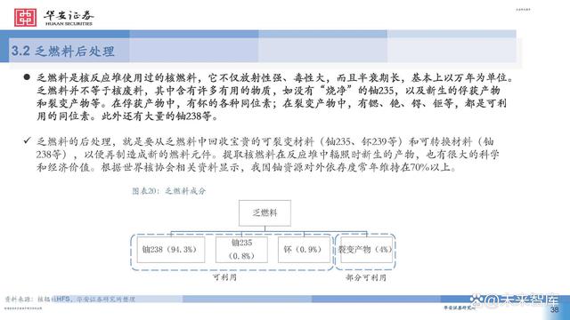 乏燃料是核反應(yīng)堆使用過的核燃料,它不僅放射性強、毒性大,而且半衰期長,基本上以萬年為單位。 乏燃料并不等于核廢料,其中含有許多有用的物質(zhì),如沒有“燒凈”的鈾235,以及新生的俘獲產(chǎn)物 和裂變產(chǎn)物等。在俘獲產(chǎn)物中,有钚的各種同位素;在裂變產(chǎn)物中,有鍶、銫、锝、钷等,都是可利 用的同位素。此外還有大量的鈾238等。