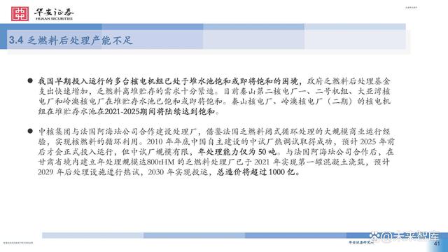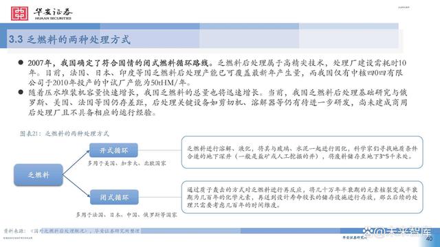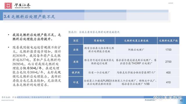 2007年,我國確定了符合國情的閉式燃料循環(huán)路線。乏燃料后處理屬于高精尖技術(shù),處理廠建設(shè)需耗時10 年。目前,法國、日本、印度等國乏燃料后處理產(chǎn)能已可覆蓋最新年產(chǎn)生量,而我國僅有中核四0四有限 公司于2010年投產(chǎn)的中試廠產(chǎn)能為50tHM/年。 隨著壓水堆裝機容量快速增長,我國乏燃料的總量也將迅速增長。當(dāng)前,我國乏燃料后處理基礎(chǔ)研究與俄 羅斯、美國、法國等國仍存差距,后處理關(guān)鍵設(shè)備如剪切機、溶解器等仍有待進一步研發(fā),尚未建成商用 后處理廠且不具備相應(yīng)的運行經(jīng)驗。