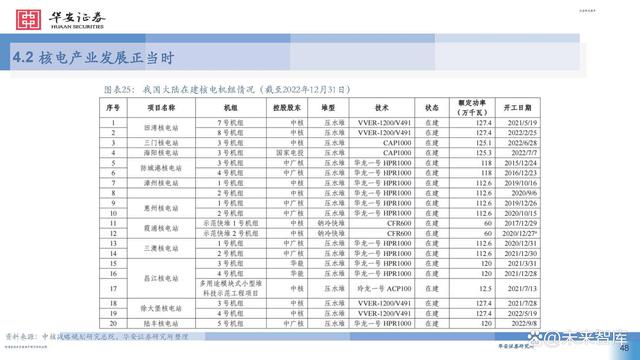 2016~2020年,美國西屋的AP1000和法國電力集團的 EPR三代核電技術(shù)全球首堆先后在我國成功建成投產(chǎn)。 我國在過去近40年中,成為全球唯一一個從沒有中斷核 電項目建設(shè)的國家,且掌握了建造世界主流核電機型的 能力,施工能力卓越,對于核電項目的建設(shè)有先進管理 理念和豐富的經(jīng)驗,對核電工期具備強有力的掌控能力。