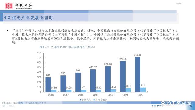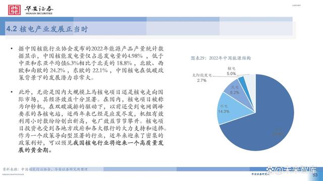 據(jù)中國核能行業(yè)協(xié)會發(fā)布的2022年能源產(chǎn)品產(chǎn)量統(tǒng)計數(shù) 據(jù)顯示,中國核能發(fā)電量僅占總發(fā)電量的4.98% ,低于 中亞和東亞平均值6.3%相比于北美的 18.8% ,北歐、西 歐和南歐的 24.2% ,東歐的 22.1% ,中國核電在低碳政 策背景下的發(fā)展?jié)摿Ψ浅4蟆?此外,無論是國內(nèi)大規(guī)模上馬核電項目還是核電走向國 際市場,其經(jīng)濟效益十分顯著。在國內(nèi),核電項目被稱 為印鈔機,在雙碳減排的驅(qū)動下,以前還受到電網(wǎng)調(diào)峰 要求的各核電站,近兩年來已經(jīng)是應(yīng)發(fā)盡發(fā),機組有效 利用小時數(shù)紛紛創(chuàng)出新高,電廠效益節(jié)節(jié)攀升。核電項 目投資也受到各地方政府和各大銀行的大力支持和追捧。 作為一個政策導(dǎo)向型顯著的行業(yè),近年來迎來了密集的 政策利好,可以預(yù)見我國核電行業(yè)將迎來一個高質(zhì)量發(fā) 展的黃金期。