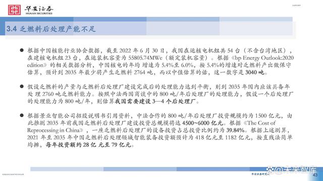 根據(jù)中國核能行業(yè)協(xié)會數(shù)據(jù),截至 2022 年 6 月 30 日,我國在運核電機組共 54 臺(不含臺灣地區(qū)), 在建核電機組 23 臺,在運裝機容量為 55805.74MWe(額定裝機容量)。根據(jù)《bp Energy Outlook:2020 edition》的相關(guān)數(shù)據(jù)分析,中國核電的年均 增速為 5.4%至 6.0%,按 5.4%的增速對乏燃料產(chǎn)出做保守 估算,預(yù)計到 2035 年最少將產(chǎn)生乏燃料 2764 噸,而以中值估算的話,這一數(shù)字是 3040 噸。
