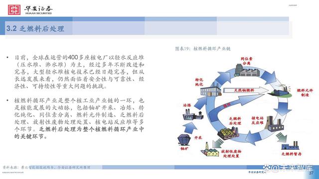目前,全球在運營的400多座核電廠以輕水反應(yīng)堆 (壓水堆、沸水堆)為主,經(jīng)過多年不斷改進和 完善,大型輕水堆核電技術(shù)已經(jīng)日趨完善,但從 長遠發(fā)展來看,仍然面臨著安全性與可靠性、經(jīng) 濟性、可持續(xù)性等重大問題的挑戰(zhàn)。 核燃料循環(huán)產(chǎn)業(yè)是整個核工業(yè)產(chǎn)業(yè)鏈的一環(huán),也 是核能發(fā)展的大動脈,包括鈾礦開采、冶煉、轉(zhuǎn) 化純化、同位素分離、燃料元件制造、乏燃料后 處理、放射性廢物處理處置、核電站反應(yīng)堆等多 個環(huán)節(jié)。乏燃料后處理為整個核燃料循環(huán)產(chǎn)業(yè)中 的關(guān)鍵環(huán)節(jié)。