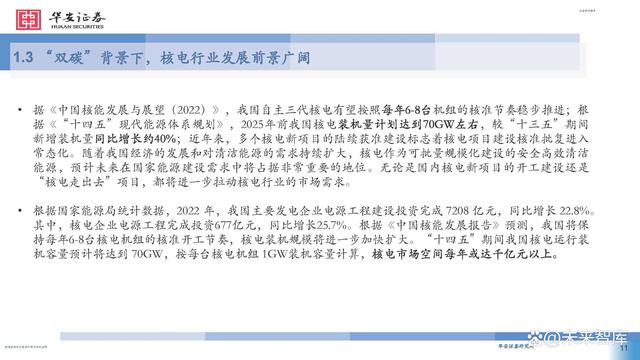 根據(jù)國家能源局統(tǒng)計數(shù)據(jù),2022 年,我國主要發(fā)電企業(yè)電源工程建設(shè)投資完成 7208 億元,同比增長 22.8%。 其中,核電企業(yè)電源工程完成投資677億元,同比增長25.7%。根據(jù)《中國核能發(fā)展報告》預(yù)測,我國將保 持每年6-8臺核電機組的核準開工節(jié)奏,核電裝機規(guī)模將進一步加快擴大。“十四五”期間我國核電運行裝 機容量預(yù)計將達到 70GW,按每臺核電機組 1GW裝機容量計算,核電市場空間每年或達千億元以上。