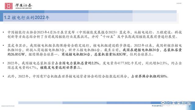 中國核能行業(yè)協(xié)會2023年4月26日在京發(fā)布《中國核能發(fā)展報告2023》藍皮書,從核電運行、工程建設(shè)、科技 創(chuàng)新等方面總結(jié)分析了當(dāng)前我國核能行業(yè)發(fā)展?fàn)顩r,并對“十四五”及中長期我國核能發(fā)展前景進行展望。藍皮書顯示,我國核電機組長期保持安全穩(wěn)定運行,核電機組建設(shè)穩(wěn)步推進。2022年以來,我國新核準核電 機組10臺,新投入商運核電機組3臺,新開工核電機組6臺。截至目前,我國在建核電機組24臺,總裝機容量 約26.81GW,繼續(xù)保持全球第一。商運核電機組54臺,總裝機容量56.82GW,位列全球第三。 2022年,我國核電總裝機容量占全國電力裝機總量的2.2%,發(fā)電量為4177.8億千瓦時,同比增加2.5%,約占全國總發(fā)電量的4.7%,核能發(fā)電量達到世界第二。 此外,2022年,中國有37臺機組在世界核電運營者協(xié)會的綜合指數(shù)達到滿分,占世界滿分機組的50%。