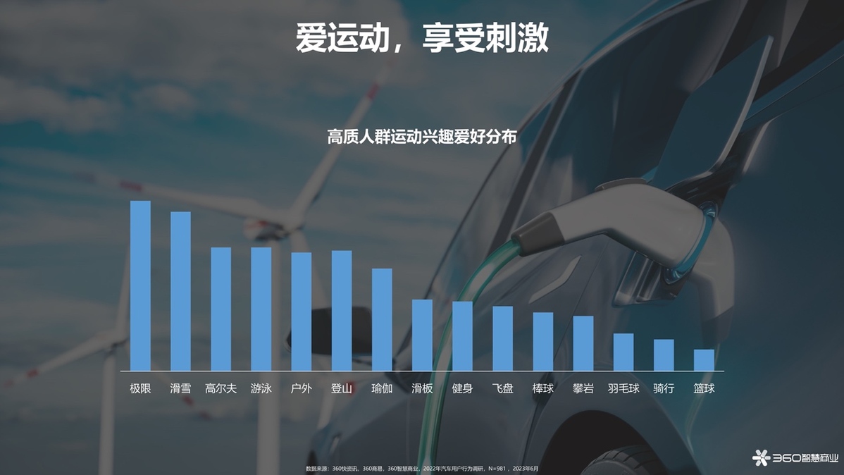 新能源汽車高質(zhì)消費(fèi)群體可接受的購(gòu)車價(jià)格較高,追求品質(zhì)的他們往往有著極限運(yùn)動(dòng)、滑雪、高爾夫等“燒錢”的愛好。