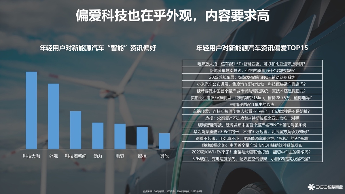 而除了特斯拉、理想、比亞迪、小鵬、蔚來等智能化新能源汽車品牌,以及具體的汽車產(chǎn)品。智能化新能源汽車內(nèi)容熱度也水漲船高,360用戶對(duì)汽車整體的內(nèi)容關(guān)注度增長(zhǎng)65.8%,而新能源汽車的內(nèi)容關(guān)注度則增長(zhǎng)177.7%。報(bào)告指出,年輕用戶在偏愛科技的同時(shí),也對(duì)新能源汽車的外觀提出了更高要求,可以說主打的就是一個(gè)“內(nèi)外兼修”。