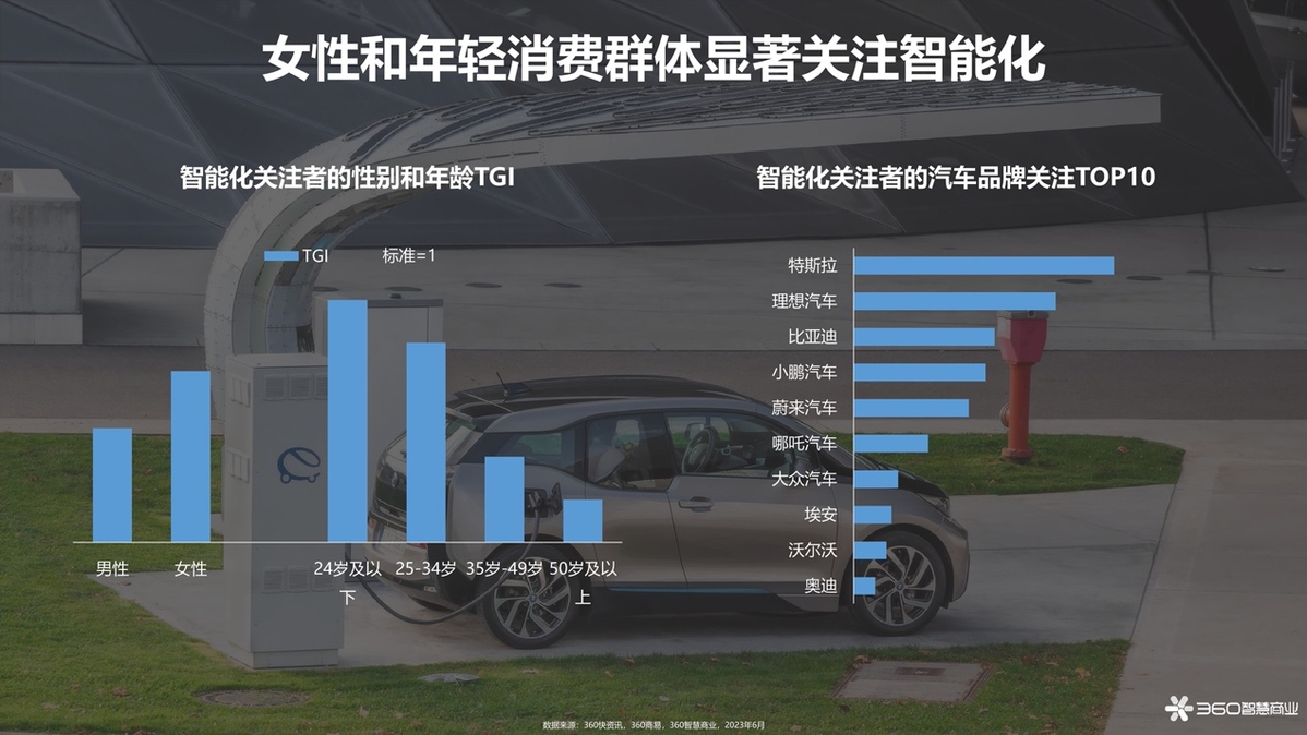 在關(guān)注新能源汽車的360用戶中,34歲以下用戶占比有絕對(duì)優(yōu)勢(shì),對(duì)新能源汽車關(guān)注度也高于汽車行業(yè)整體。與此同時(shí)年輕群體對(duì)于技術(shù)迭代和新技術(shù)的應(yīng)用也抱有極大熱情,“智能化”是他們與新能源汽車行業(yè)間又一堅(jiān)固鏈接,值得一提的是,對(duì)于新能源汽車的智能化,年輕女性群體展示出了更高的偏好度。
