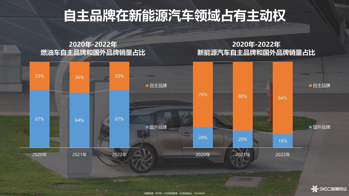而與這一趨勢(shì)相應(yīng)的是我國(guó)新能源汽車自主品牌的興起,相較于老牌的汽車廠商,我國(guó)自主品牌在向電動(dòng)化轉(zhuǎn)型的進(jìn)程中更加輕便且有政策扶持,獲得了迅猛的發(fā)展。2022年,新能源汽車銷量中,自主品牌占比高達(dá)84%,遠(yuǎn)超國(guó)外品牌。