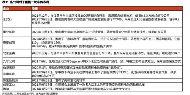 目前氫能二輪車布局主要來自于二輪車企業(yè)向氫能業(yè)務(wù)擴(kuò)展。如永安行2B端推出Y200,2C端針對(duì)歐洲市場推出Y400。雅迪科技集團(tuán)與天能集團(tuán)圍繞氫能達(dá)成合作協(xié)議。