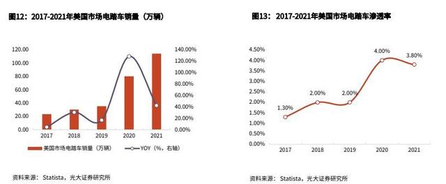 美國市場起步較晚,客戶群體主要為運(yùn)動(dòng)愛好者和極限發(fā)燒友。2020年以來,受疫情催化及政策推動(dòng),更多消費(fèi)者選擇電踏車以滿足其通勤及休閑需求,客戶群體進(jìn)一步擴(kuò)大。2021年美國電踏車銷量114萬輛,同比增長40.7%,滲透率提升至3.8%。從美國政府提出的一系列稅收抵免、通勤津貼、關(guān)稅暫緩的政策,以及美國市場目前較低的滲透率來看,未來美國市場仍具有很大發(fā)展?jié)摿Α?/p>
