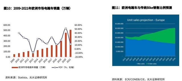 歐洲電踏車預(yù)計(jì)后續(xù)持續(xù)高速增長。歐洲電動(dòng)自行車市場以德國、法國、意大利和荷蘭市場為主導(dǎo),預(yù)計(jì)歐洲地區(qū)的年均電動(dòng)自行車購買量將從2019年的370萬輛增長到2030年的1700萬輛,歐洲自行車協(xié)會(huì)(CONEBI)預(yù)計(jì)2030年歐洲電動(dòng)車市場滲透率將突破50%,整體市場增長潛力可期。