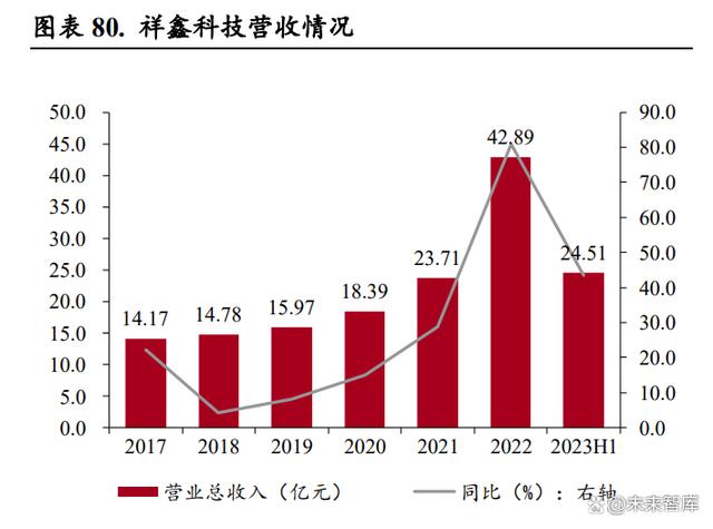 公司營(yíng)收增長(zhǎng)迅速,新能源、儲(chǔ)能精密沖壓模具及金屬結(jié)構(gòu)件貢獻(xiàn)營(yíng)收逐年增加。公司營(yíng)業(yè)收入從 2017 年的 14.17 億元增加到 2022 年的 42.89 億元,年均復(fù)合增長(zhǎng)率達(dá)到 24.80%,2023 年上半年實(shí)現(xiàn)營(yíng)業(yè)收入 24.51 億元,同比增長(zhǎng) 43.38%。分產(chǎn)品來(lái)看,2019 年以來(lái)新能源汽車零部件和儲(chǔ)能設(shè)備 結(jié)構(gòu)件業(yè)務(wù)占總營(yíng)收比例明顯提升,其中 2022 年新能源汽車產(chǎn)品收入占比達(dá) 59.62%,成為公司主 要的收入來(lái)源,給公司帶來(lái)新的收入增長(zhǎng)點(diǎn)。