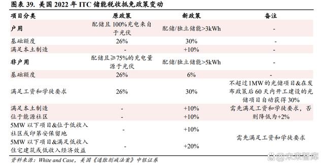 儲(chǔ)能稅收減免提升至以 30%為基礎(chǔ),經(jīng)濟(jì)性進(jìn)一步提升。 此前的 ITC 政策稅收抵免的基礎(chǔ)額度為 26%,現(xiàn)在在滿足工資和學(xué)徒要求后,基礎(chǔ)抵免可以達(dá)到 30%,另外,如果同時(shí)能夠滿足其他條件, 例如本土制作、位于能源社區(qū)等可進(jìn)一步提升抵免的額度,儲(chǔ)能電站的經(jīng)濟(jì)性得到進(jìn)一步提升。