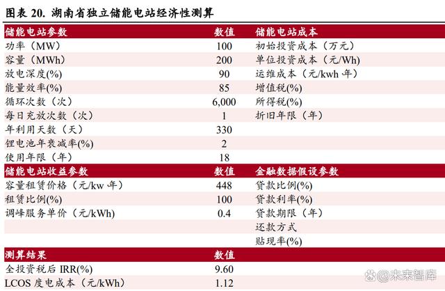 獨(dú)立儲(chǔ)能電站經(jīng)濟(jì)性可觀。我們以湖南省的實(shí)際情況為例,來(lái)測(cè)算獨(dú)立儲(chǔ)能電站的經(jīng)濟(jì)性,在目前 的各種條件下,湖南省獨(dú)立儲(chǔ)能電站的全投資稅后 IRR 達(dá)到 9.60%,具有客觀的收益性。 1)容量租賃收入假設(shè):參考湖南省的城步儒林 100MW/200MWh 儲(chǔ)能電站項(xiàng)目已經(jīng)簽訂的容量租賃 合同,湖南省的容量租賃價(jià)格為 448 元/kw*年。2)電力輔助服務(wù)收入假設(shè):電力輔助服務(wù)包括為電網(wǎng)公司提供調(diào)峰、調(diào)頻等服務(wù),按照每次調(diào)用規(guī) 模及調(diào)用次數(shù),電網(wǎng)公司給儲(chǔ)能電站支付費(fèi)用。 參考湖南省的現(xiàn)行 政 策以及城步儒林 100MW/200MWh 儲(chǔ)能電站項(xiàng)目的運(yùn)行情況,假設(shè)一年調(diào)用 330 天,每天一次充放,調(diào)用費(fèi)用為每 次 400 元/MWh。
