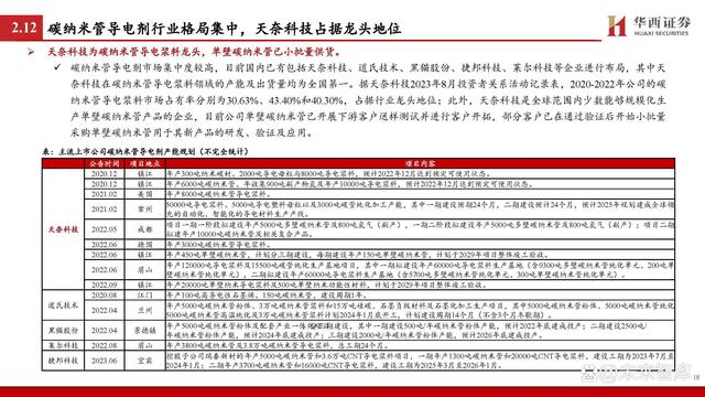 導(dǎo)電劑加速離子&電子移動(dòng)速率,碳納米管較常規(guī)導(dǎo)電劑性能更優(yōu)。除鋰電池主材外,導(dǎo)電劑作為鋰電池的材料構(gòu)成中的關(guān)鍵輔材,同樣影響著鋰電池的倍率性能。據(jù)GGII,導(dǎo)電劑在活性物質(zhì)之間、活性 物質(zhì)與集流體之間起到收集微電流的作用,以減小電極的接觸電阻并加速電子的移動(dòng)速率,同時(shí)也能有效提高鋰離子在電極材料中的遷 移速率,從而提高電極的充放電效率。 據(jù)GGII,目前市場(chǎng)上應(yīng)用的鋰電池導(dǎo)電劑包括以炭黑、導(dǎo)電石墨為代表的常規(guī)導(dǎo)電劑和以碳納米管、石墨烯為代表的新型導(dǎo)電劑。據(jù)天 奈科技招股書(shū),相較于常規(guī)導(dǎo)電劑的代表炭黑,碳納米管具有更好的導(dǎo)電性能,并能夠使鋰電池保持良好的電子和離子傳導(dǎo);此外,碳 納米管憑借其較高長(zhǎng)徑比的特性,相較于炭黑能夠進(jìn)一步提高鋰電池的倍率性能。據(jù)GGII預(yù)計(jì),在高倍率電池需求增加等因素的推動(dòng)下, 新型導(dǎo)電劑將在未來(lái)幾年逐步替代傳統(tǒng)導(dǎo)電劑,其中碳納米管有望成為市場(chǎng)主流。此外,碳納米管一般分為單壁和多壁碳納米管,單壁 碳納米管因?yàn)殚L(zhǎng)徑比更大,從而擁有更優(yōu)的理化性能和導(dǎo)電性能,有望成為碳納米管未來(lái)的重點(diǎn)發(fā)展方向。