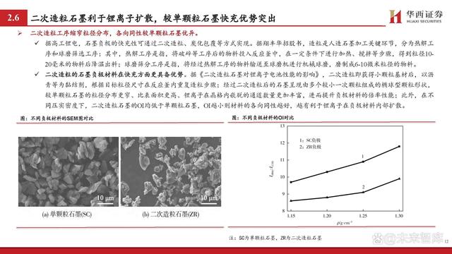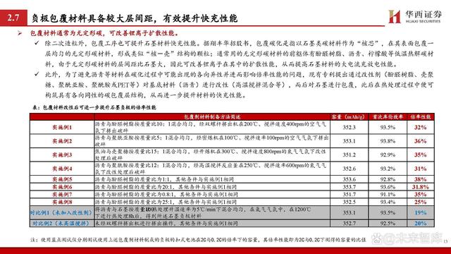 包覆材料通常為無(wú)定形碳,可改善鋰離子擴(kuò)散性能。 除二次造粒外,包覆工序也可提升石墨材料快充性能。據(jù)翔豐華招股書(shū),包覆碳化是指以石墨類(lèi)碳材料作為“核芯”,在其表面包覆一 層均勻的無(wú)定形碳材料,形成類(lèi)似“核-殼”結(jié)構(gòu)的顆粒;通常用的無(wú)定形碳材料的前軀體有酚醛樹(shù)脂、瀝青、檸檬酸等低溫?zé)峤馓疾?料,由于無(wú)定形碳材料的層間距比石墨大,因此可改善鋰離子在其中的擴(kuò)散性能,從而提高石墨材料的大電流充放電性能。 此外,為了避免瀝青等材料在碳化過(guò)程中可能出現(xiàn)的各向異性并進(jìn)而影響倍率性能的問(wèn)題,現(xiàn)有專(zhuān)利提出通過(guò)改性劑(酚醛樹(shù)脂、殼聚 糖、聚酰亞胺、聚酰胺或PET等)對(duì)基底材料(瀝青)進(jìn)行改性(高溫?cái)嚢杌旌系?,而后對(duì)石墨進(jìn)行包覆,此后在熱處理過(guò)程中便可 構(gòu)筑具有各向同性的碳包覆層結(jié)構(gòu),從而進(jìn)一步提升材料的快充性能。