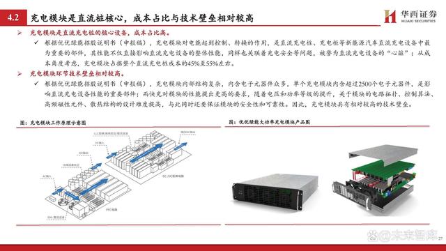 充電模塊是直流充電樁的核心設(shè)備,成本占比高。 根據(jù)優(yōu)優(yōu)綠能招股說(shuō)明書(shū)(申報(bào)稿),充電模塊對(duì)電能起到控制、轉(zhuǎn)換的作用,是直流充電樁、充電柜等新能源汽車(chē)直流充電設(shè)備中最 為重要的部件,其性能不僅直接影響直流充電設(shè)備的整體性能,同樣也關(guān)聯(lián)著充電安全等問(wèn)題,被譽(yù)為直流充電設(shè)備的“心臟”;從成 本角度考慮,充電模塊占據(jù)整個(gè)直流充電樁成本的45%至55%左右。