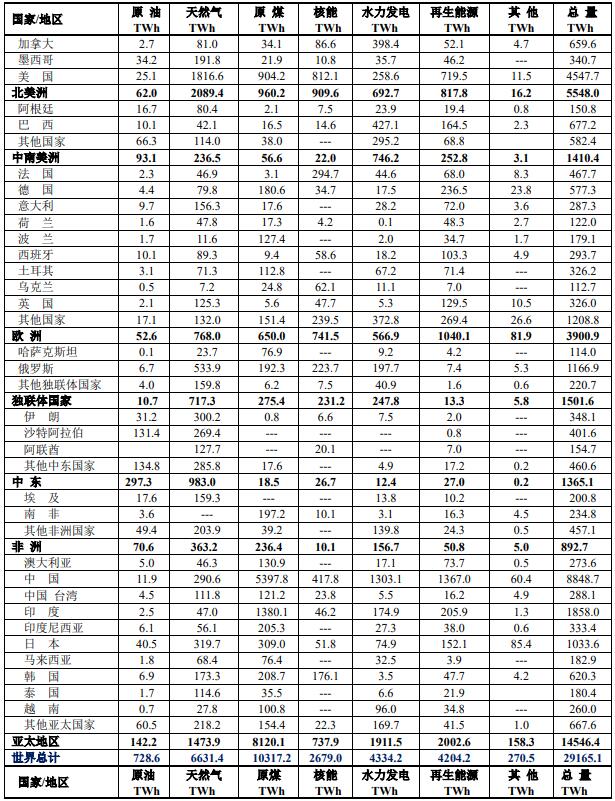 表1、 2022年世界各國(guó)電力結(jié)構(gòu)(以TWh表示)