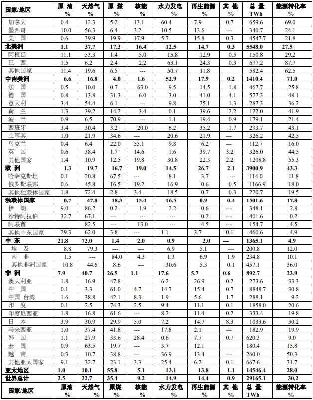 從表1世界各國(guó)電力結(jié)構(gòu)可以看出: