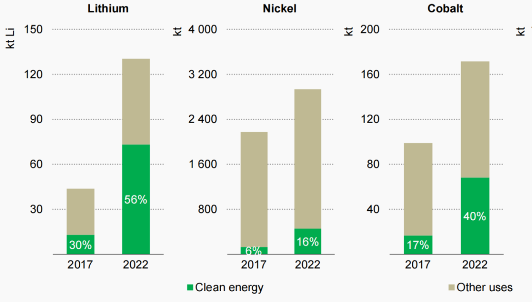 圖4 清潔能源應(yīng)用占鋰、鎳、鈷需求比重 (來源:IEA)