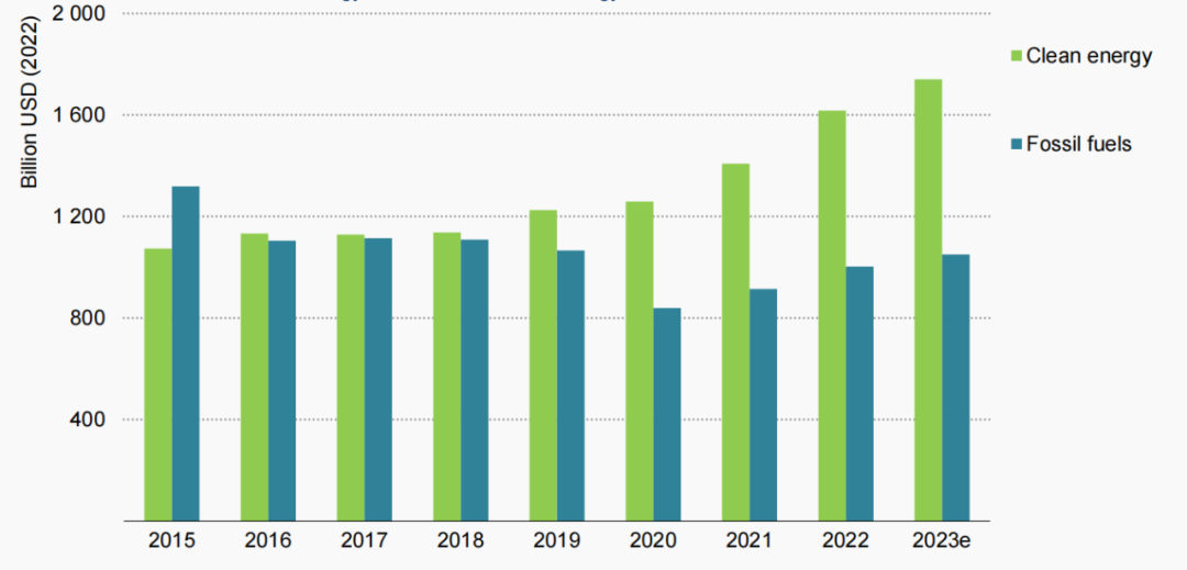 圖1 2015—2023年全球?qū)η鍧嵞茉春突剂系耐顿Y情況 (來源:IEA)