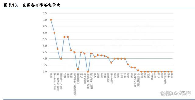 國家發(fā)改委推動合理拉大峰谷電價差,引導(dǎo)電力用戶削峰填谷。2021 年 7 月,國家發(fā)改委 印發(fā)《關(guān)于進(jìn)一步完善分時電價機(jī)制的通知》,部署各地進(jìn)一步完善分時電價機(jī)制,合理拉 大峰谷電價價差,為引導(dǎo)電力用戶削峰填谷、促進(jìn)儲能加快發(fā)展釋放了清晰強(qiáng)烈的價格信 號:(1)優(yōu)化峰谷電價機(jī)制:積極優(yōu)化峰谷電價機(jī)制,科學(xué)劃分峰谷時段,合理確定峰谷 電價價差,系統(tǒng)峰谷差率超過 40%的地方,峰谷電價價差原則上不低于 4:1;其他地方原 則上不低于 3:1。(2)建立尖峰電價機(jī)制:在峰谷電價的基礎(chǔ)上推行尖峰電價機(jī)制,主要基 于系統(tǒng)最高負(fù)荷情況合理確定尖峰時段,尖峰電價在峰段電價基礎(chǔ)上上浮比例原則上不低 于 20%。可參照尖峰電價機(jī)制建立深谷電價機(jī)制。隨后,各省市分時電價政策步入快速完 善期,出臺相關(guān)政策調(diào)整峰谷時段劃分和電價浮動比例。