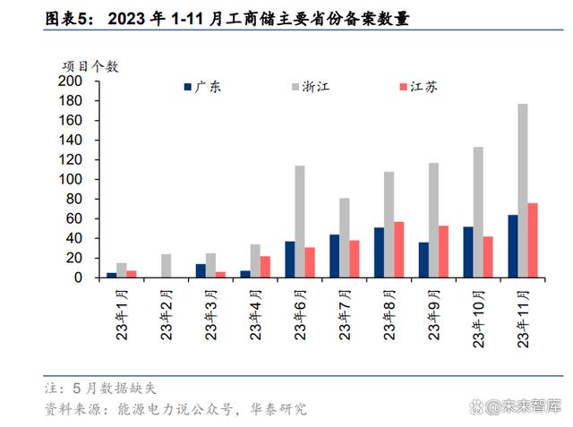 多因素推動,23 年高增趨勢初現(xiàn)。根據(jù)能源電力說公眾號的不完全統(tǒng)計,僅 2023 年 7-11 月,國內(nèi)工商業(yè)儲能備案項目個數(shù)達(dá) 1305 個。從工商業(yè)分布較為集中的廣東、浙江、江蘇 三個省份來看,月度備案項目數(shù)量均呈現(xiàn)大幅上升趨勢。據(jù)不完全統(tǒng)計,2023 年以來我國 工商業(yè)儲能備案規(guī)模已經(jīng)達(dá)到 3.46GW/9.26GWh。工商業(yè)儲能高速增長的勢頭已經(jīng)初步顯 現(xiàn),2023 年成為國內(nèi)工商儲的放量元年。