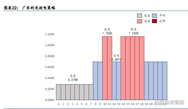 峰谷時段持續(xù)優(yōu)化,多省份滿足兩充兩放。根據(jù)各地區(qū)的分時電價策略,我們梳理出其對 應(yīng)的峰谷套利策略,超 20 個省份已滿足兩充兩放的充放電策略,浙江、山西、新疆由于午 時為低谷電價,可實現(xiàn) 2 次“谷充峰放”策略,其余多數(shù)省份可采用“谷充峰放+平充峰放” 策略。江蘇、黑龍江、福建、翼北可實現(xiàn)三充三放(2.5 次滿充放)。多省份已經(jīng)具備較為 優(yōu)越的投資經(jīng)濟(jì)性。