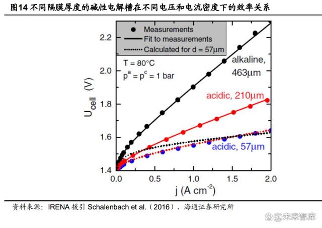 減小隔膜厚度:可以提高效率并減少電力消耗。隔膜越薄,將 OH-從陰極運(yùn)輸 到陽(yáng)極的阻力就越低,但由于氣體滲透水平較高,從而可能導(dǎo)致安全問(wèn)題。另 一個(gè)缺點(diǎn)是耐久性較低,因?yàn)楦裟ぶ懈锌赡軙?huì)形成針孔,導(dǎo)致機(jī)械魯棒性降 低??傮w而言,堿性電解槽的隔膜厚度應(yīng)該接近 PEM 槽和 AEM 槽的水平。對(duì) 于 PEM 來(lái)說(shuō),目前最先進(jìn)的膜厚度為 125-175 μm,并有潛力降低到 20 μm。 ALK 目前的隔膜厚度為 460 μm,將其降低到 50 μm 可以使堿槽在 1A/cm2 下 的效率從 53%提升到 75%。