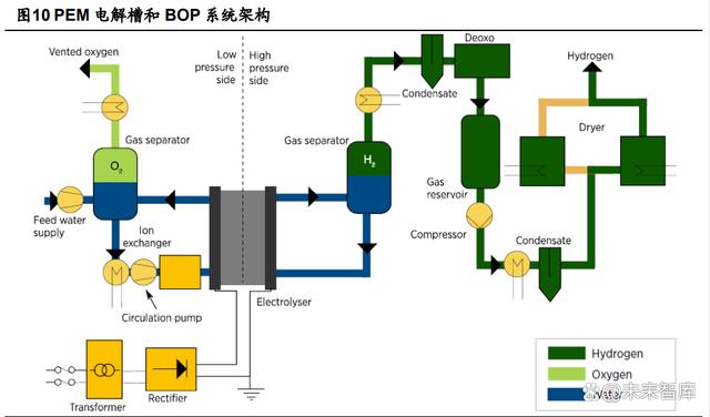 堿性電解槽需要將電解質(zhì)(KOH)再循環(huán)到電池組組件中,從而需要額外的堿液循 環(huán)泵,這個(gè)過(guò)程中會(huì)產(chǎn)生效率損耗(通常小于電堆功耗的 0.1%)。完成電解反應(yīng)后,氫 氣和氧氣會(huì)在氣液分離系統(tǒng)中分別與堿液分離。補(bǔ)水系統(tǒng)負(fù)責(zé)保證水源的穩(wěn)定連續(xù)供給, 并且需要考慮隔膜的水滲透。此外,系統(tǒng)組件還包括后續(xù)的脫氧干燥系統(tǒng)等。