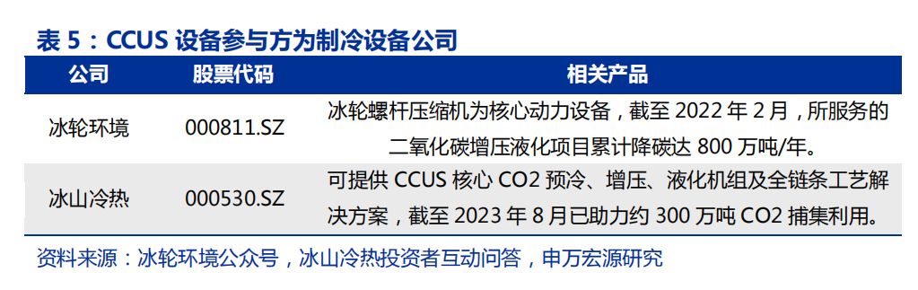 2)藍(lán)氫:在化石能源制氫基礎(chǔ)上增添碳捕集設(shè)備,至2025 年需增設(shè)年捕集量2000 萬噸的CCUS 設(shè)備,核心動力裝置為螺桿壓縮機(jī),廠商主要包括冰輪環(huán)境、冰山冷熱;
