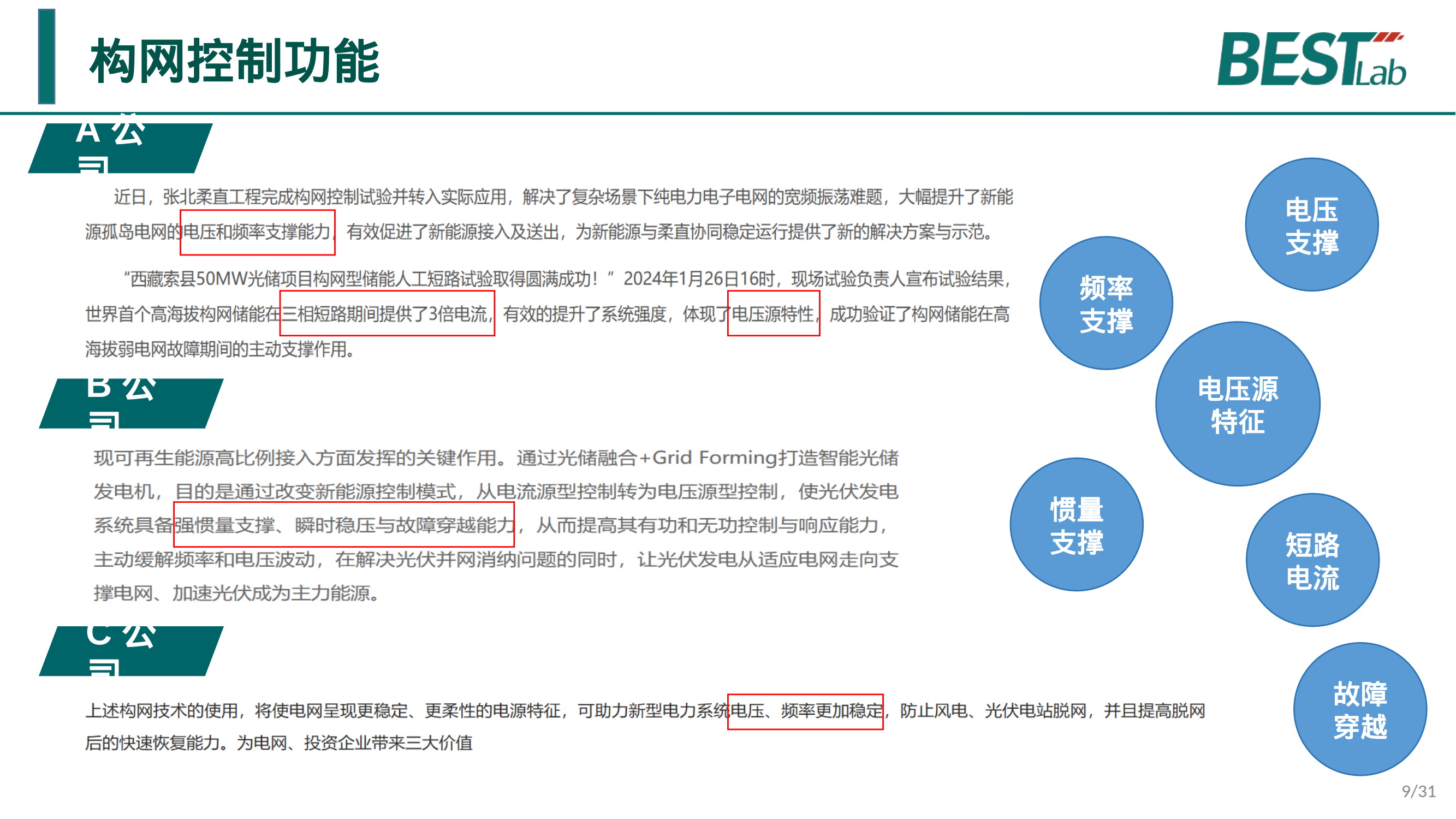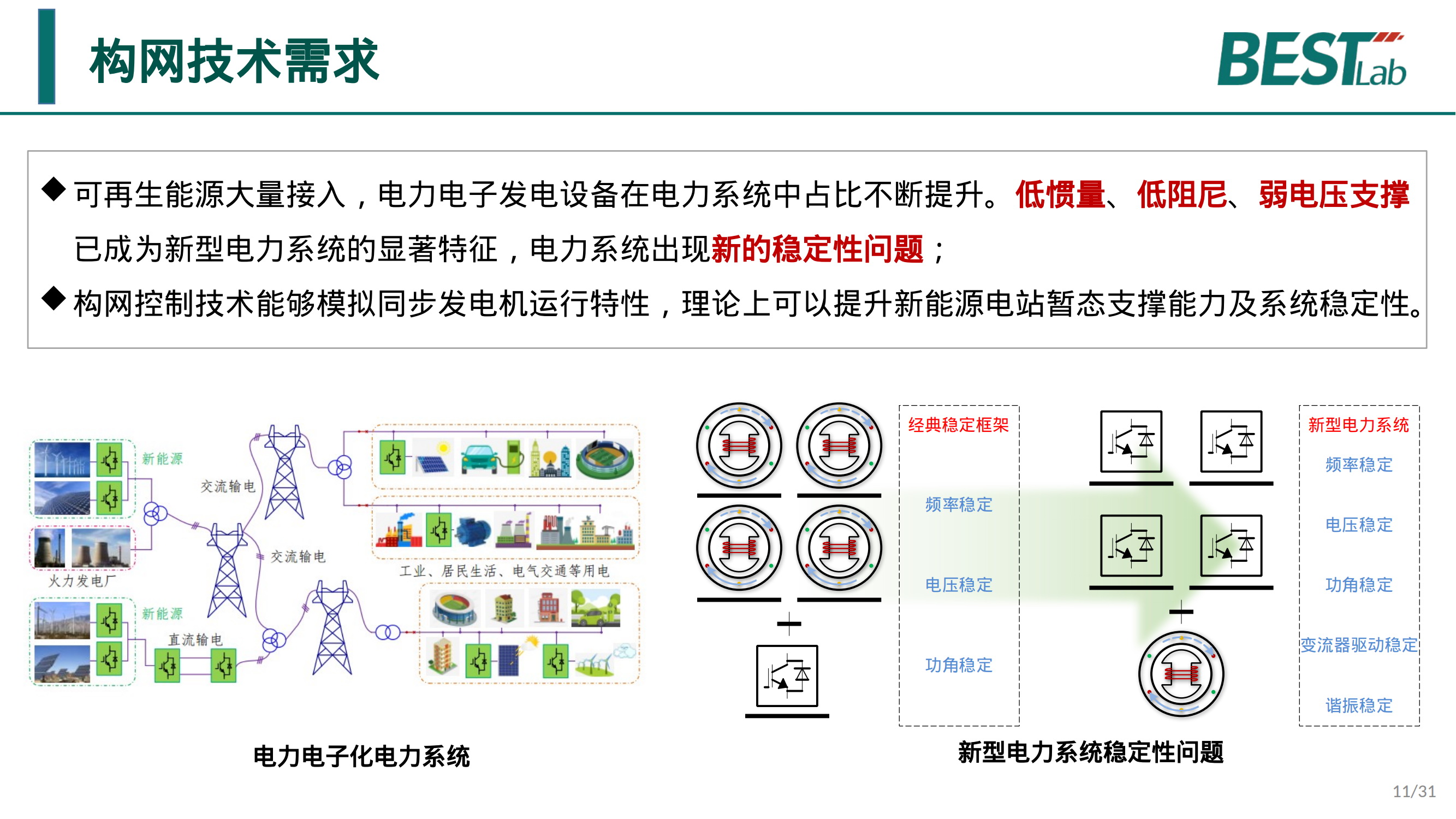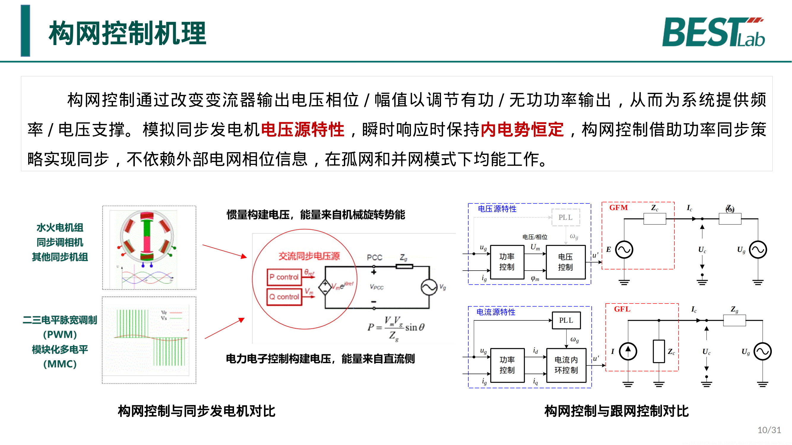 構(gòu)網(wǎng)控制技術(shù)作為報(bào)告的核心內(nèi)容,被描述為一種電力電子控制技術(shù),能夠模擬同步發(fā)電機(jī)運(yùn)行特性,提升新能源電站的暫態(tài)支撐能力及系統(tǒng)穩(wěn)定性。報(bào)告還對(duì)比了構(gòu)網(wǎng)控制與同步發(fā)電機(jī)和跟網(wǎng)控制的不同,并提出了構(gòu)網(wǎng)技術(shù)的需求,包括頻率穩(wěn)定、電壓穩(wěn)定和功角穩(wěn)定等。