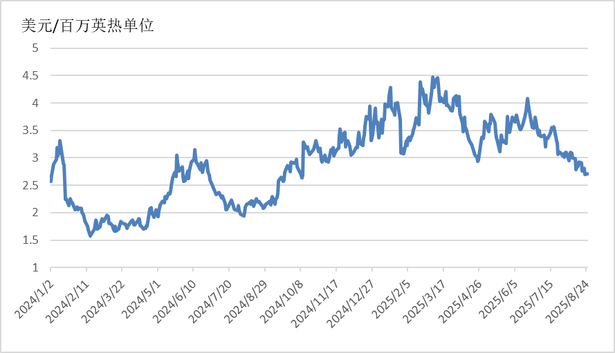 截至8月25日,美國Henry Hub天然氣主力合約收于2.709美元/百萬英熱單位,月環(huán)比下降12.47%,相較于2024年同期的2.12美元/百萬英熱單位,上漲27.78%。