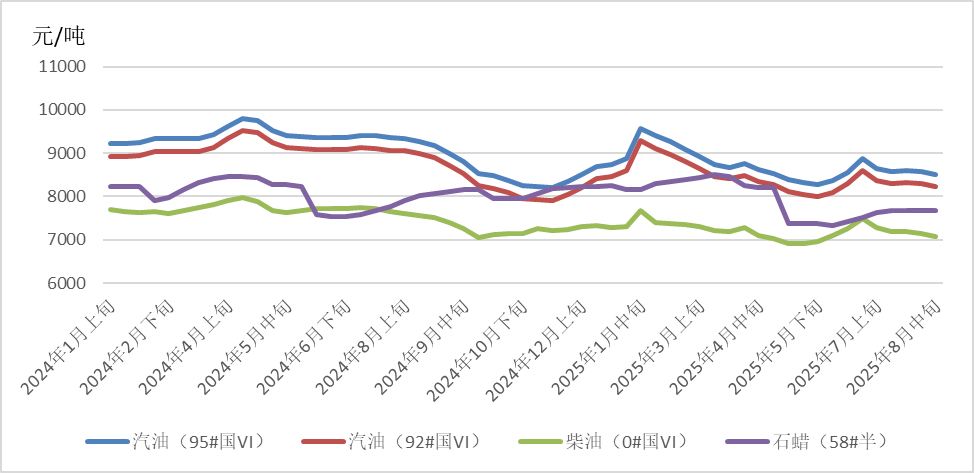 8月中旬,IEA上調全球石油供應過剩預期,美國能源信息署(EIA)預測2025年美國原油日產量將創(chuàng)1341萬桶紀錄,夏季駕駛旺季臨近尾聲原油需求下降預期增強,中美關稅暫停措施再延長90天等因素推動國際油價延續(xù)下跌態(tài)勢。然而,市場對美聯儲9月降息的預期增強,阿拉斯加美俄峰會并未取得實質性進展,俄烏局勢不確定性推升地緣風險溢價,受上述因素影響,國際油價跌幅有所收窄。