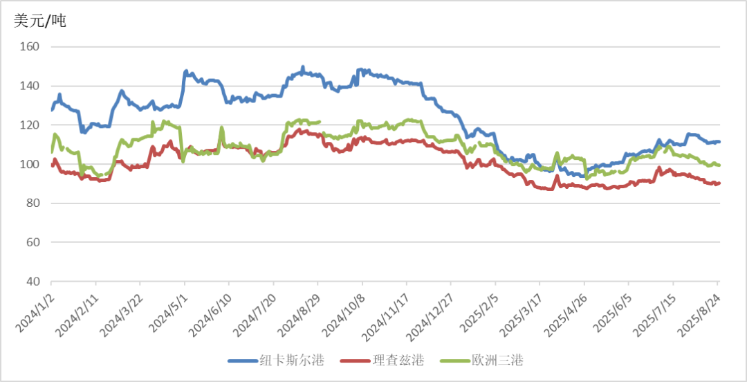 截至8月25日,澳大利亞紐卡斯爾港煤炭期貨價格報收于111.3美元/噸,月環(huán)比上漲1.00%,相較2024年同期的145.7美元/噸,下降23.61%;南非理查茲港煤炭期貨價格報收于90.2美元/噸,月環(huán)比下降4.85%,相較2024年同期的115.4美元/噸,下降21.84%;歐洲三港煤炭期貨價格報收于99.5美元/噸,月環(huán)比下降4.70%,相較2024年同期的121.15美元/噸,下降17.87%。